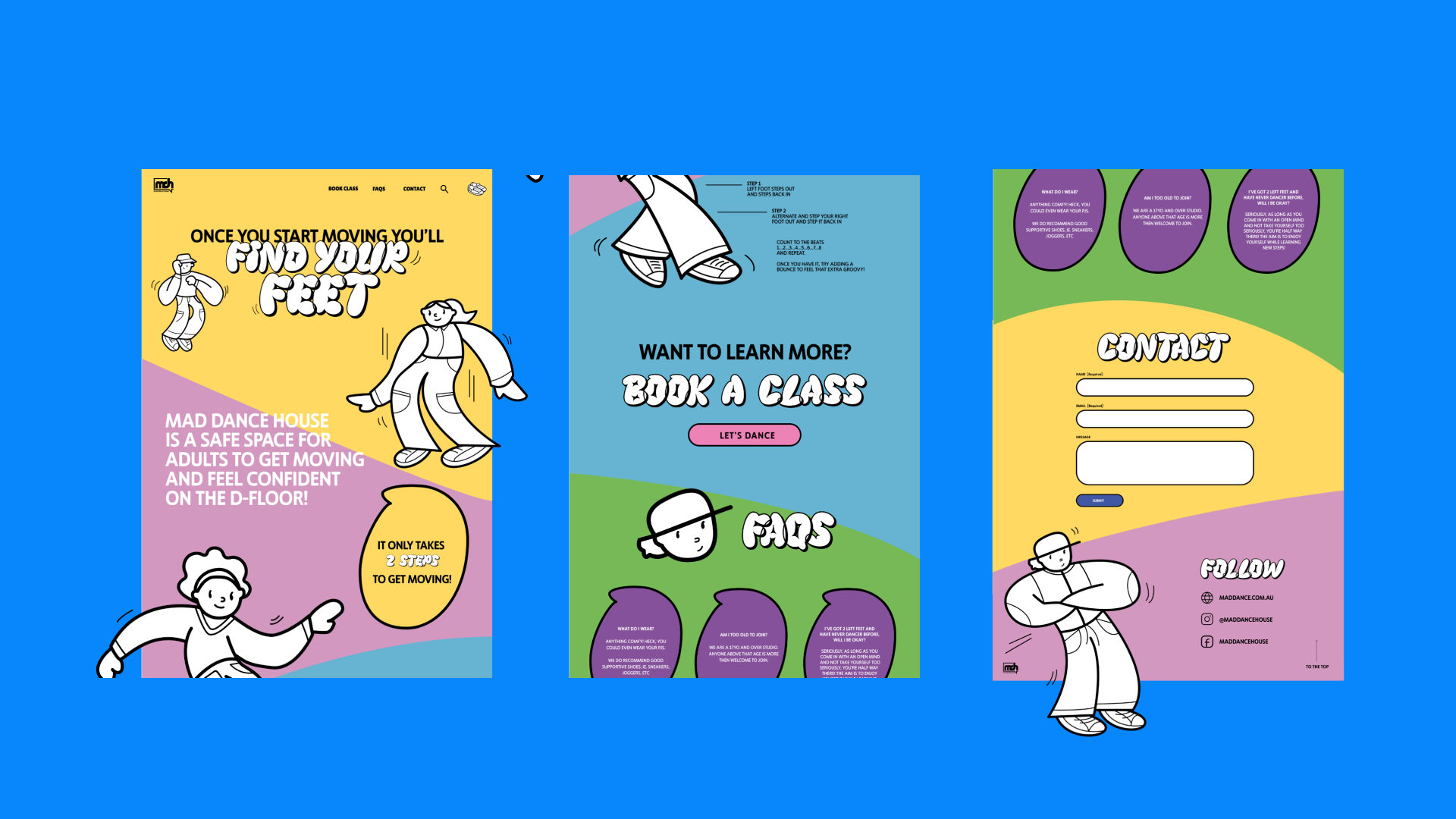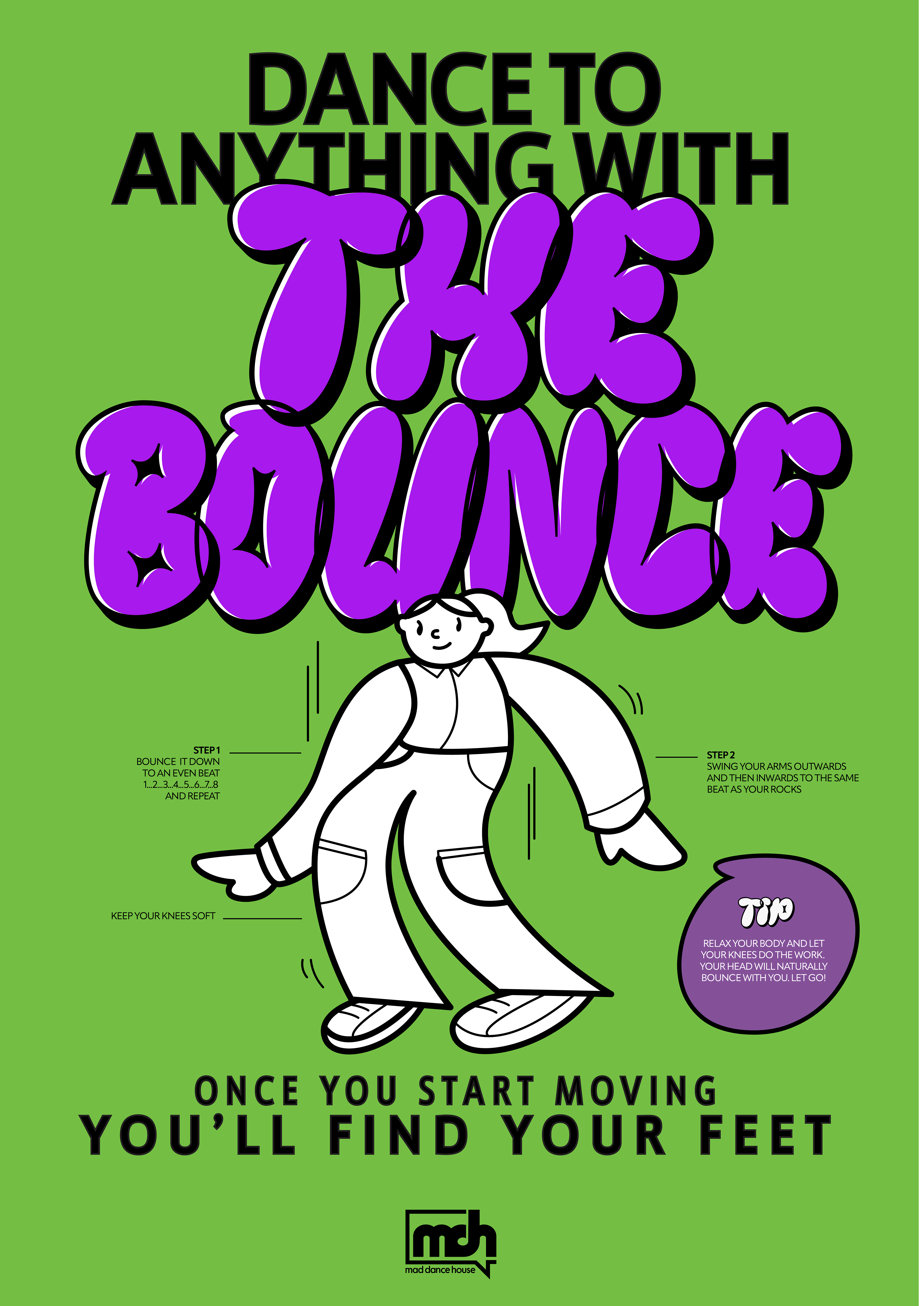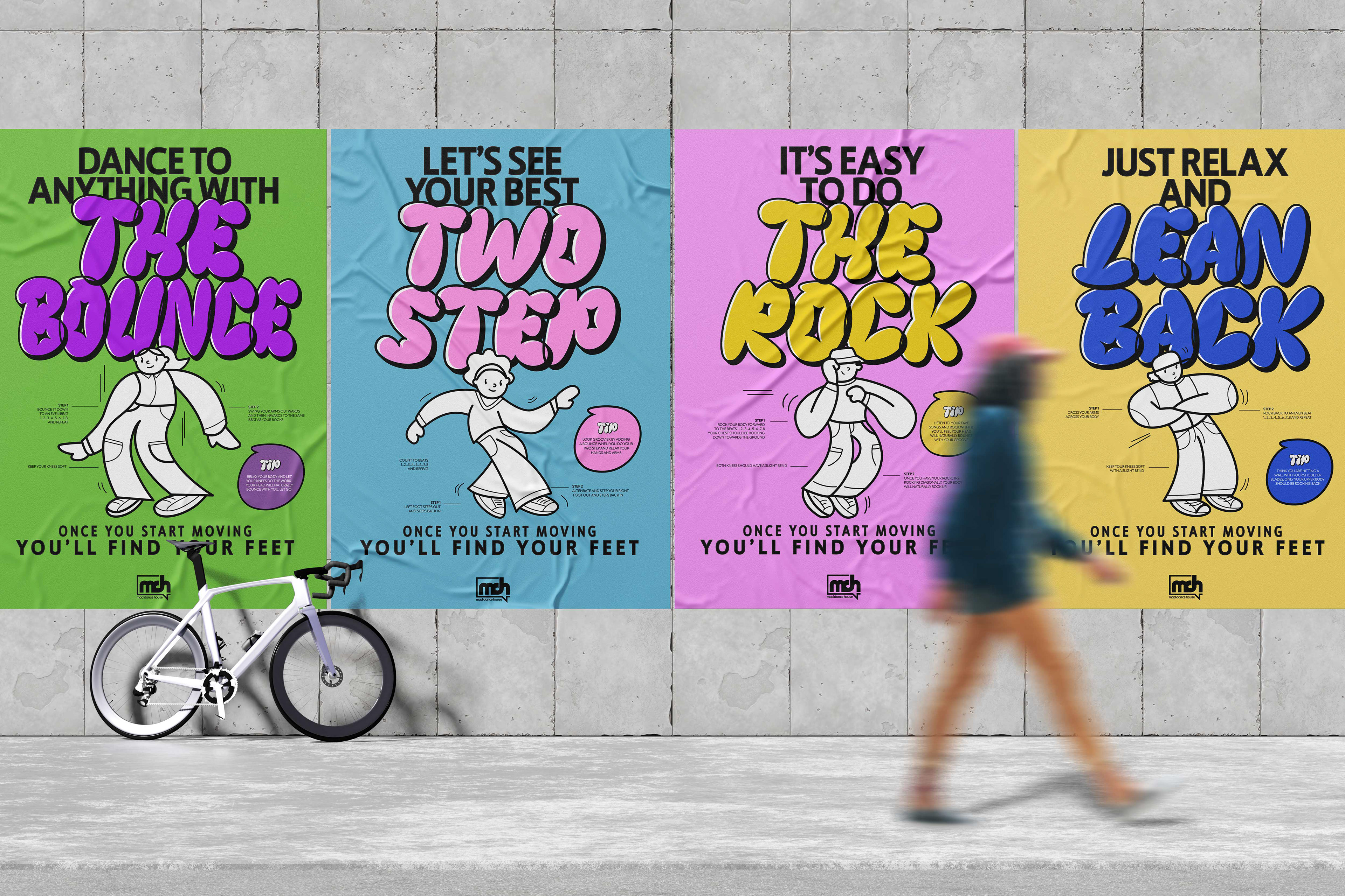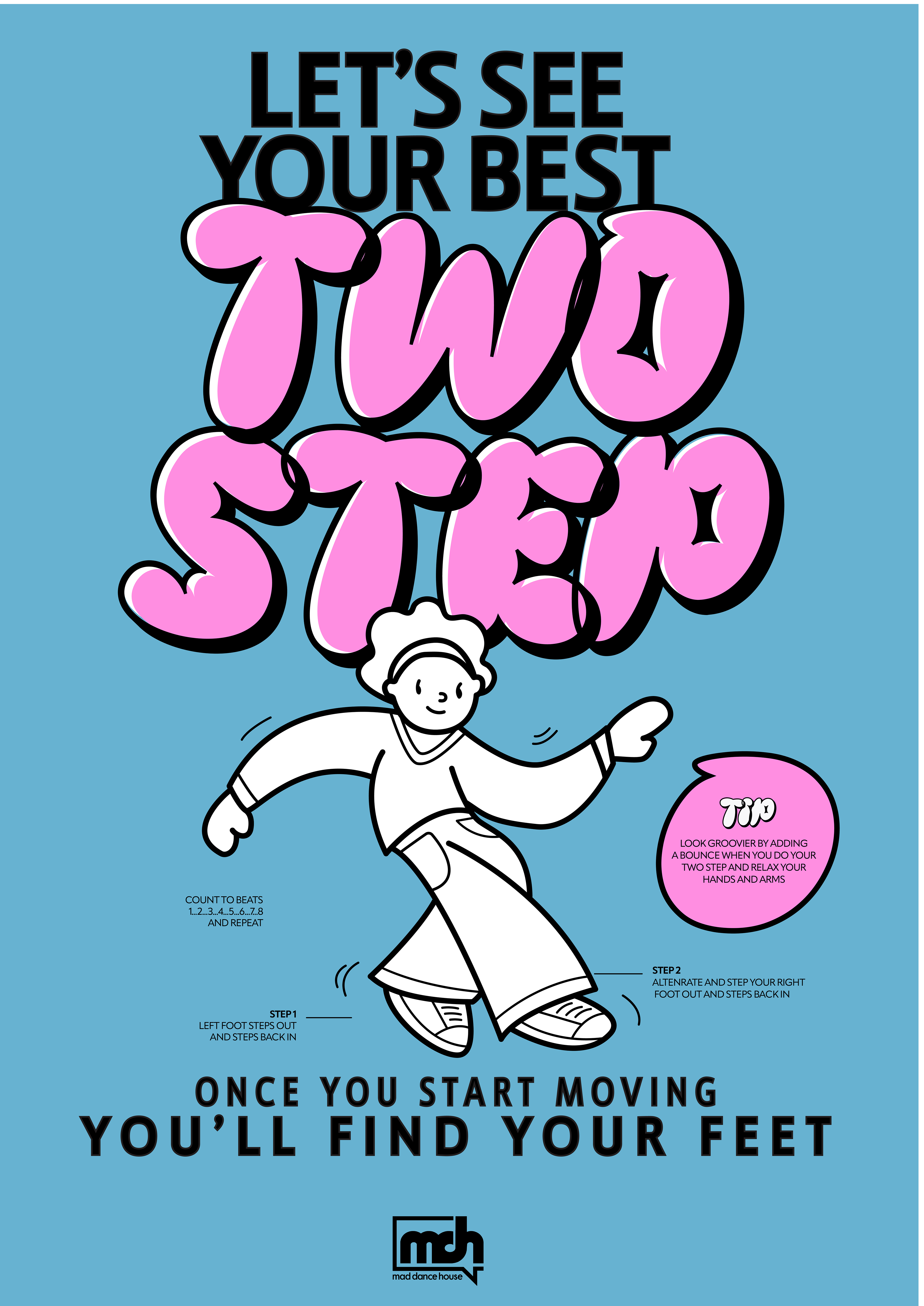 A campaign created for Mad Dance House. This dance campaign was created to give adults the confidence to get moving with 2 simple steps. These are demonstrated by basic dance moves, playful illustration and type.
